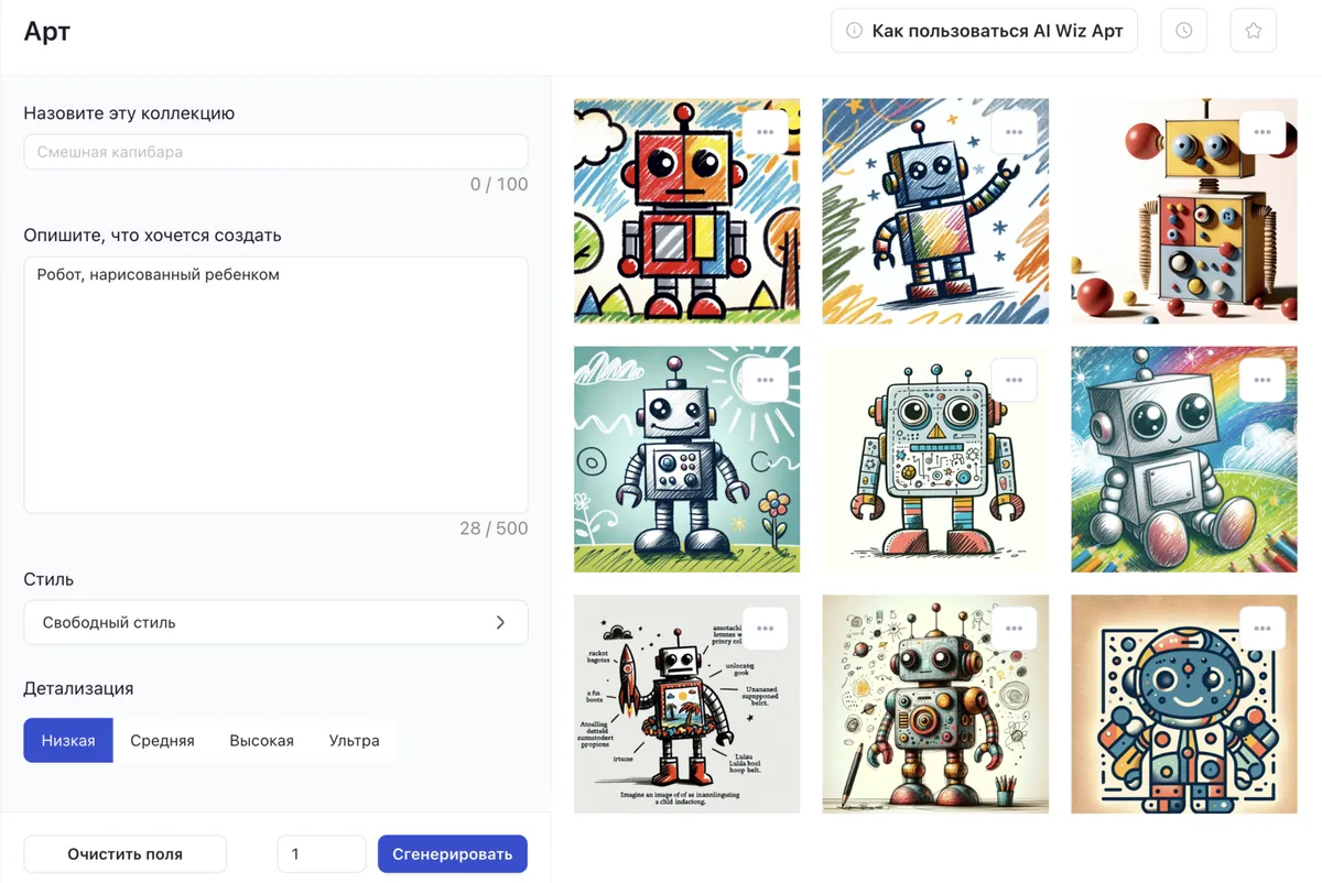 - Количество вариантов для генерации от 1 до 4: создавайте несколько вариаций одного и того же изображения, чтобы выбрать самый подходящий.