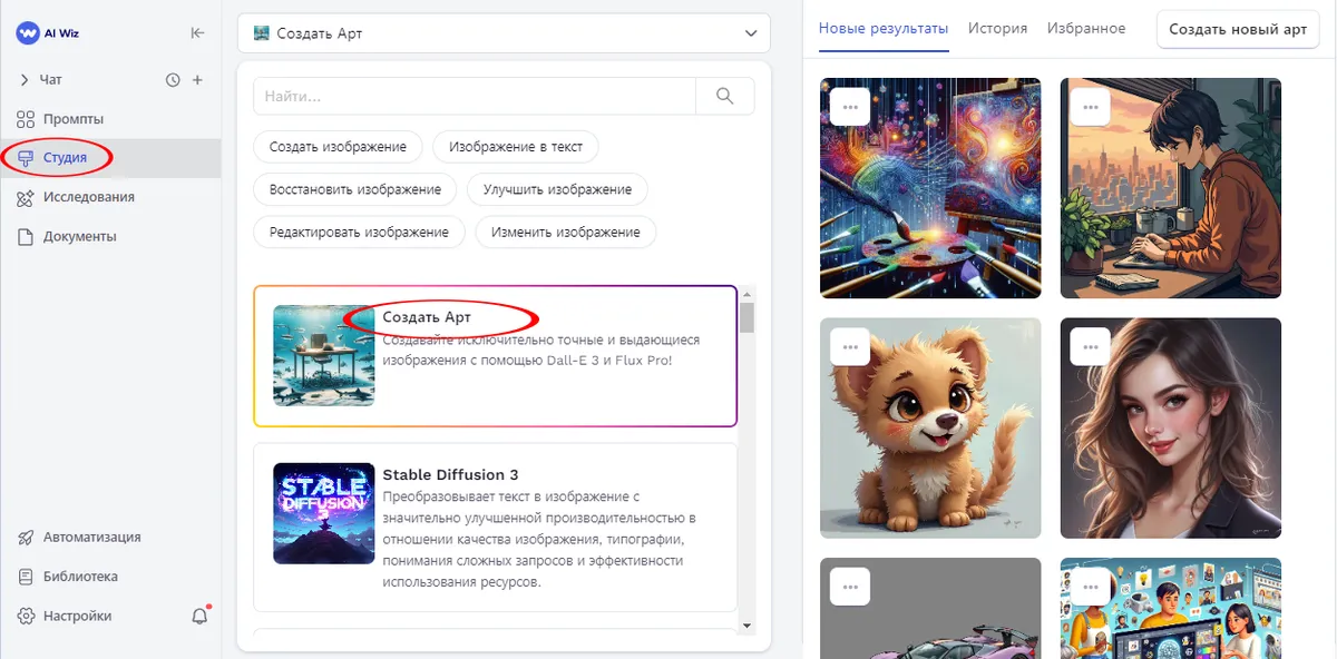 Для доступа к AI Студии на панели инструментов слева нужно выбрать соответствующий пункт. После этого откроется интерфейс, в котором можно использовать инструмент Арт или желаемую модель из обширного списка. Каждая обладает уникальными характеристиками и специализацией, будь то создание фотореалистичных изображений, стилизованной концептуальной графики или даже стикеров и эмоджи.