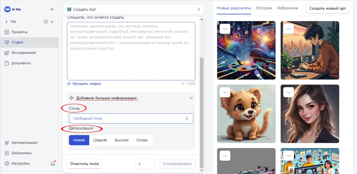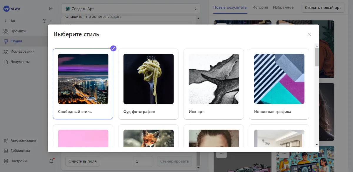 - Стиль изображения: Выберите из большого списка стилей - от свободного до киберпанка или 3D-иллюстрации. Это поможет задать общее настроение картинки.