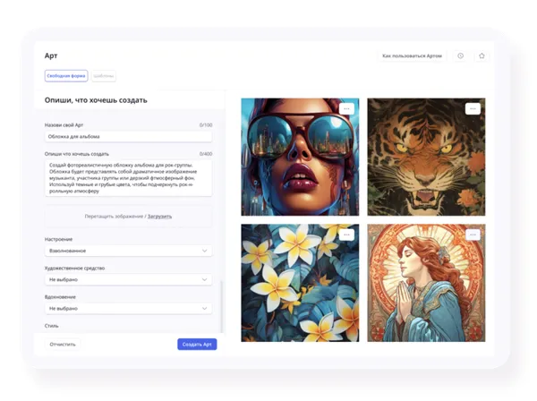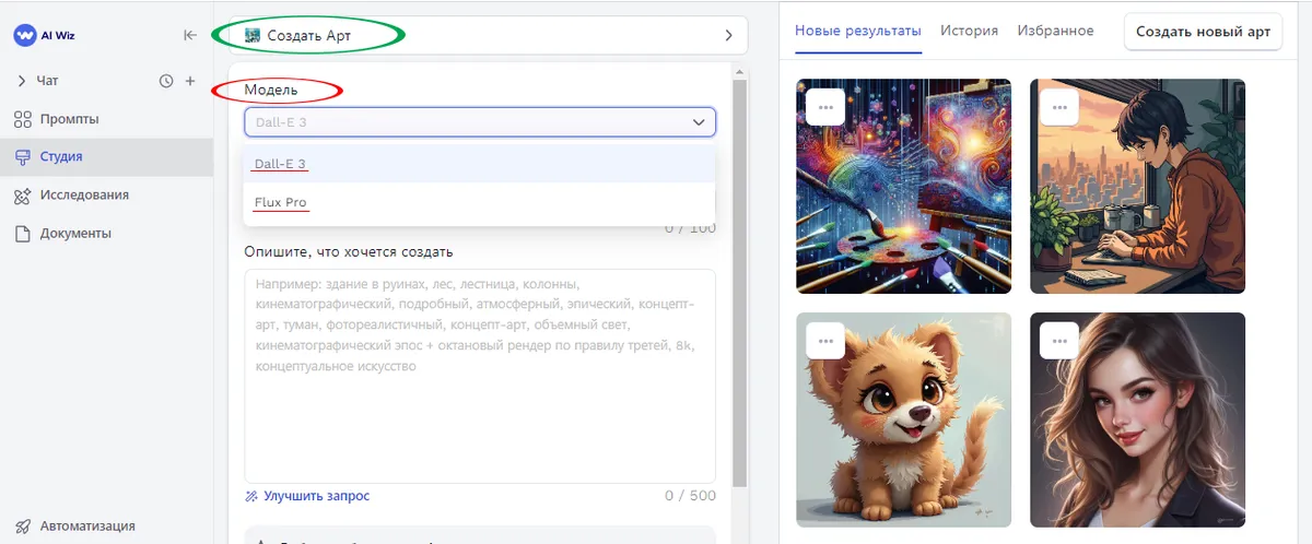 Для начала работы нажмите на карточку "Создать Арт". В открывшемся интерфейсе в окне "Модель" вы можете выбрать одну из двух доступных нейросетей: