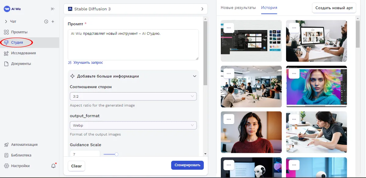 AI Wiz представляет новый инструмент – AI Студию. Это творческая мастерская, объединяющая 33 мощные ИИ-модели для создания, улучшения и преобразования изображений. От реалистичных картинок и цифровых произведений искусства до стикеров, эмодзи и улучшения качества существующих фотографий – AI Студия открывает перед пользователями невиданные ранее возможности визуального творчества.