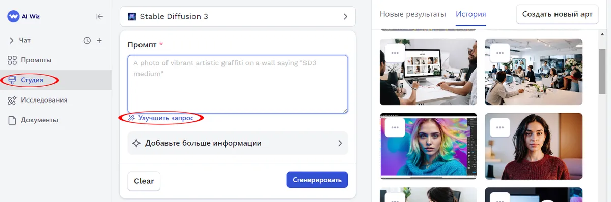 - вводите текстовые подсказки для управления процессом улучшения изображения.